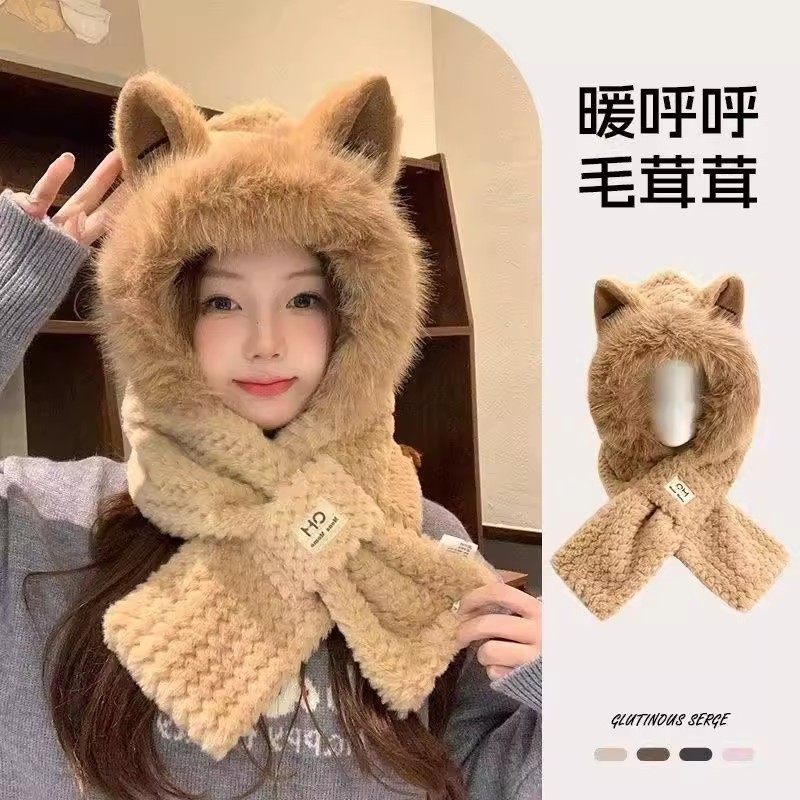 BY-秋冬季可爱冬天狐狸耳朵围巾加厚一体围脖毛绒保暖护耳帽