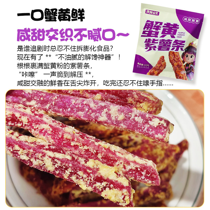 :原价13.99元,现在领取5元优惠券,预估到手8.99元,【凌拾公主】蟹黄味紫薯条4袋;快抢!!紫薯条4包*40g到手8.99元 (芝士味、蟹黄味可选)一包才2块多! 开袋就是浓郁的蟹黄味道,咸甜可口!