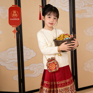 厵yuan女童毛衣2025冬季新款中大童保暖新中式针织衫+马面裙套装