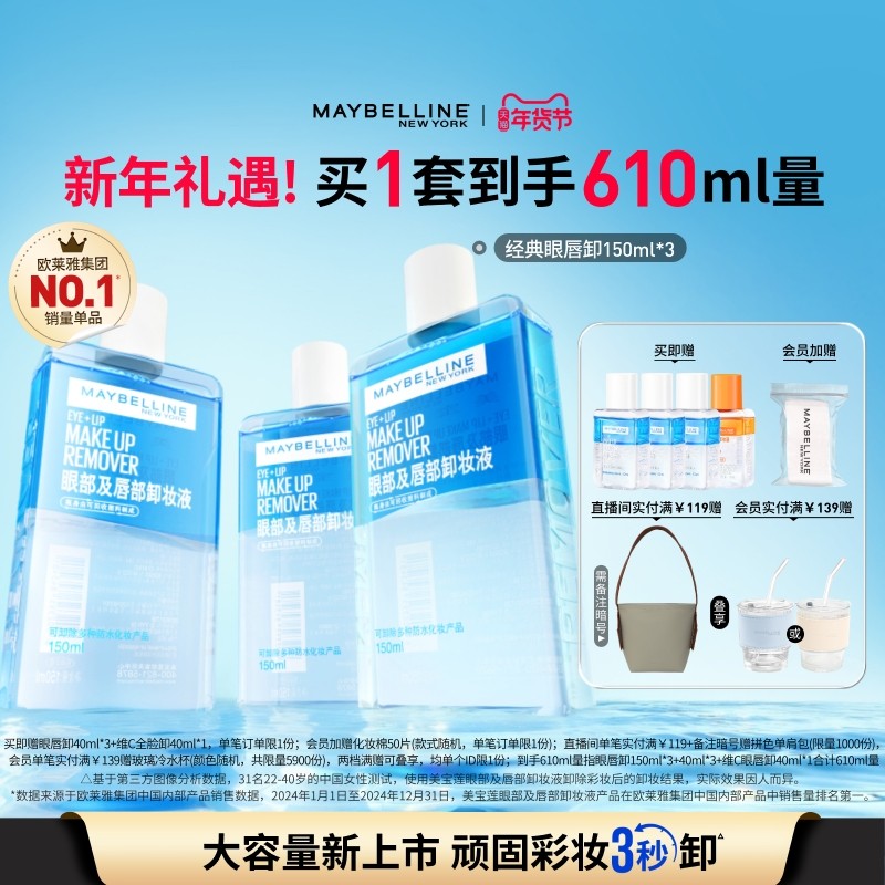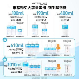 :原价153.19元,现在领取10元优惠券,预估到手143.19元,仅118!美宝莲三合一眼唇卸妆水共1010ml;选项一共得1010ml+会员加送化妆棉,右上角...淘金币抵扣5.81+凑美妆券900-70+叠消费券480-60低至118.2元。 - 深层清洁眼唇卸妆,水油分离,卸妆前摇一摇,温和不刺激,敏感肌也可用,轻松卸妆无残留。一瓶卸全脸,让肌肤更加Q弹!